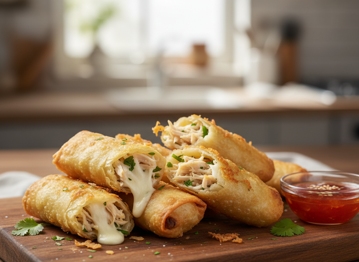 Juicy chicken combined with creamy melted cheese inside a crispy, golden roll.