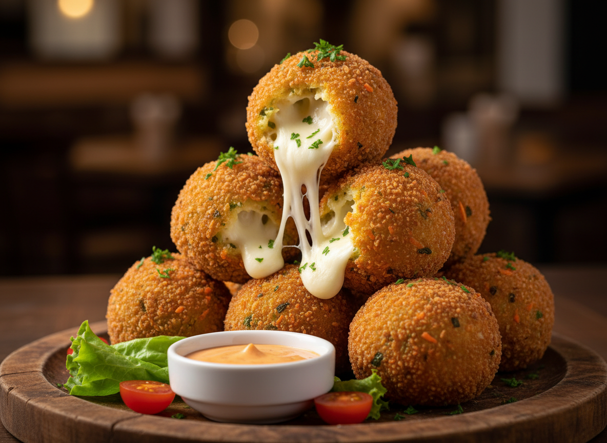 Crispy golden balls filled with seasoned vegetables and creamy melted cheese for a rich, tasty bite
